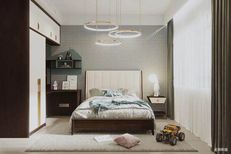 桌柜一体接壤设计,绚丽与沉稳相互衬托,足以达到空间最好的状态。饱和又柔润的色块,整齐坐落于床体柜身,通过极简规划分配,刻画出完美的实木纹理。造型独特的床前灯,像一抹阳光照进心扉,散发着童真与梦幻的味道,形成了独有的轻奢精致感。