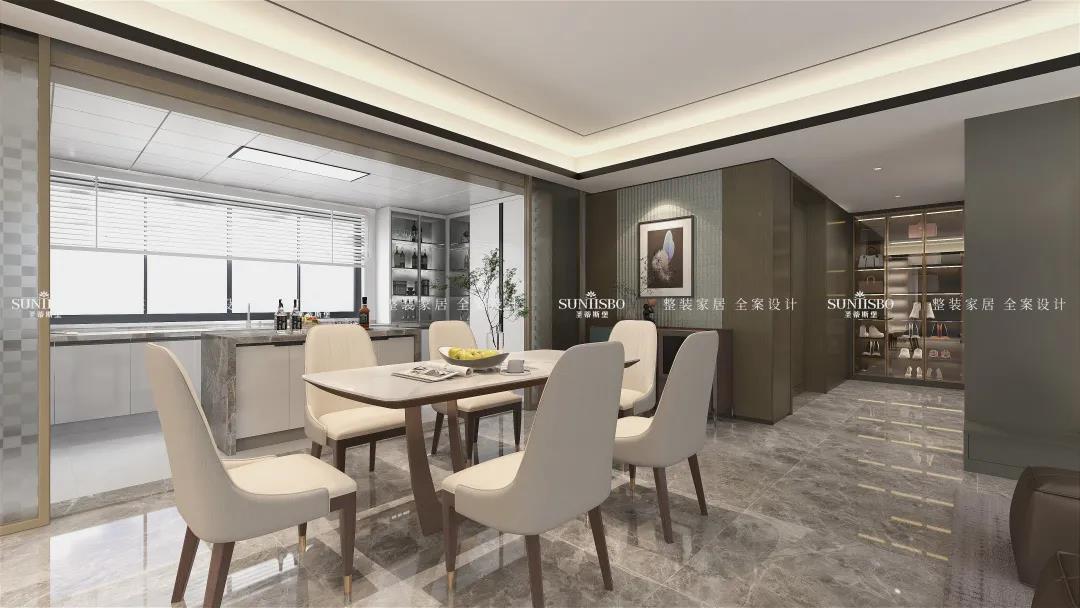 奶白色的餐桌椅搭配烟熏色的柜体,对于爱做饭的男主人来说他真的爱惨了,